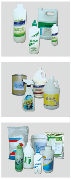 | 通用洗衣粉 強力洗衣粉 強力增自洗衣粉 濃縮洗衣粉 強力臺布粉 柔軟毛巾粉 彩漂粉 低溫彩漂粉 超強乳化劑 超強乳化劑(非離于型) 增白脫灰洗衣粉 漂粉/氯漂粉 柔順劑(粉) 強力合成堿 中和酸劑 軟水劑 去漬酸粉 漿粉 衣領(lǐng)凈 絲毛洗滌劑 羽絨服清洗劑 除銹劑 去油去污增白膏 高效洗衣露 毛巾清香劑 強力醫(yī)用洗衣粉 去血漬洗衣粉 消毒液 消毒液(II型) | Universal detergent Strong detergent Whitening strong detergent Concentrated liquid Strong table-doth powder Soft towl powder Color bleaching powder Low-temper bleaching powder color Super Emulsifier Super emulsifier (non-ionic) Detergent for whitening and dust removing Bleaching powder/chlorine bleaching powder Softener (powder) Synthesis strong alkali Dilute acid Soft water agent Acid powder Powder slurry Collar detergent Silky detergent Down Cleaner Rust removing agent Whitening cream for oil decontamination High-efficiency detergent Towel fresh detergent Supper medical detergent Detergent for blood removal Disinfectant Disinfectant (II type) | |
